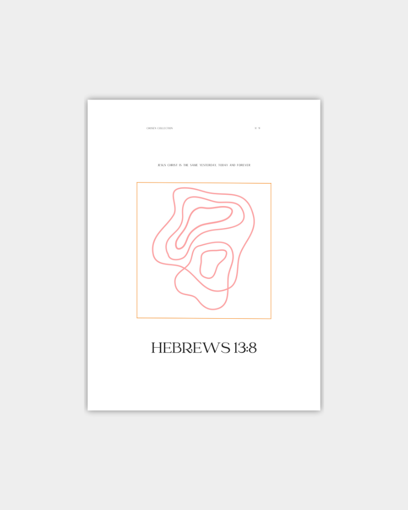 Abstract, orange and pink line art, simple, minimalist Christian poster wall art with Hebrews 13:8 Bible verse in the chosen collection.