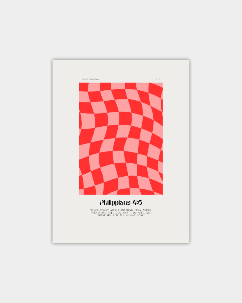 Trendy, eclectic, modern contemporary, pink + red checkered Christian poster wall art with Philippians 4:6 Bible verse in the chosen collection. What you will receive: INSTANT DOWNLOAD FORMATS: JPG 300 DPI HIGH RESOLUTION JPG in the following sizes: 30×40, 18×24, 12×16, 9×12, 6×8, 3×4 **Please note no physical items will be shipped. **Due to the…