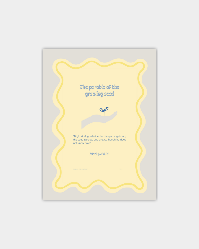 Trendy, modern wavy yellow and blue hand holding seedling sprouting Christian wall art with Mark 4:26-29 bible verse