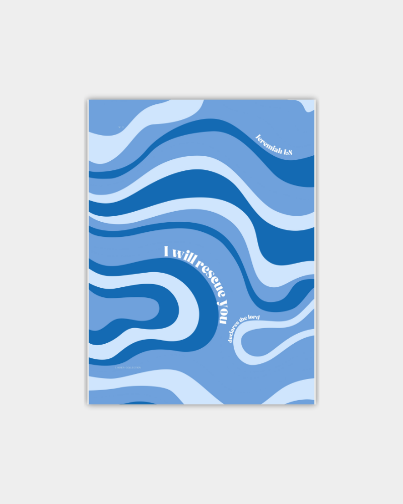 Trendy, eclectic, modern contemporary, blue monochromatic wavy, retro Christian poster wall art with Jeremiah 1:8 Bible verse in the chosen collection.